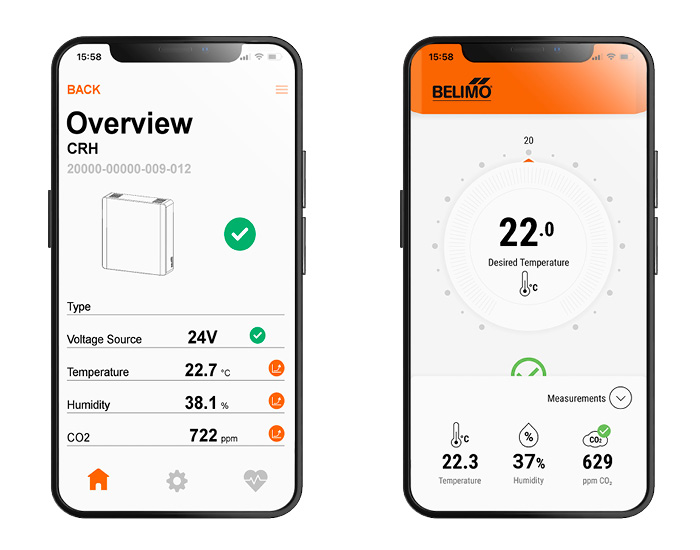 Belimos rumsensorer er lige så lette at indstille og integrere i bygningens styringssystem. De kommunikerer i de mest gængse busprotokoller, BACnet, Modbus m.m. Belimo Assistant App'en gør det desuden nemt at indstille rumsensorerne og sætte dem i drift. Indstillingerne klares i appen på en smartphone og overføres trådløst med NFC til enheden – også uden den er tilsluttet strøm. Ved eventuelle fejl er det lige så nemt at diagnosticere rumsensoren med Belimo Assistant App.