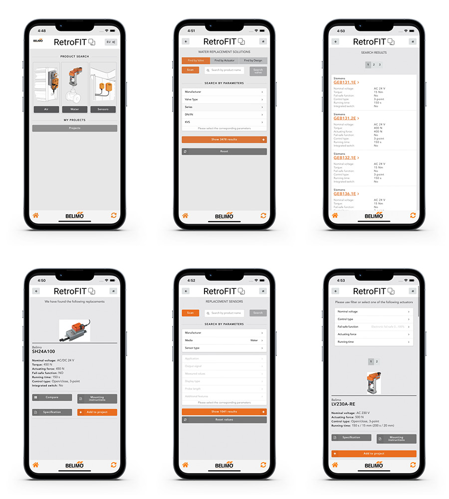 Med Belimo RetroFIT+ app på din smartphone kan du nemt udskifte forældede eller defekte ventilaktuatorer og sensorer – uanset, hvilken producent, der oprindeligt har lavet den. Belimo RetroFIT+ app’en finder hurtigt det Belimo-produkt, der matcher den gamle enheds specifikationer.