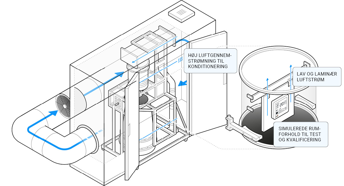 Testkammeret, hvor sensoren er anbragt, forsynes med en laminær luftstrøm, der efterligner strømninger i indeluften. Den styres præcist fra 0,05 m/s til 0,3 m/s. Testkammeret er placeret inde i et isoleret skab, hvor temperaturen kan reguleres med en nøjagtighed på 0,1 °C og meget hurtigt.