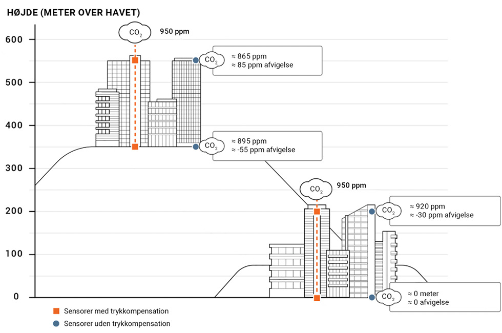 F.eks. giver 400 m over havet 70 ppm afvigelse i den målte CO2-koncentration. Dvs. højdeforskellen alene er skyld i næsten hele den tolerance på ±75 ppm, som er den højest tilladte i f.eks. flere af USA’s delstater. Hvis en CO2-sensor skal være pålidelig i forskellige bygninger – og lande – bør den derfor have absolut trykkompensation.