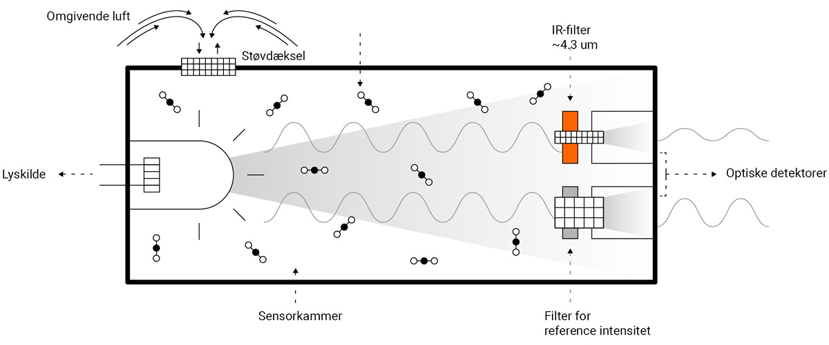 En CO2-sensor fungerer med en lyskilde og to detektorer. Den ene detektor har et filter med et vindue, som svarer til et højdepunkt i CO2-absorptionsspektret (ca. 4,3 µm), så den registrerer, hvor meget lys der absorberes af CO2-molekyler i luften. Den anden detektor måler den ufiltrerede lysintensitet. Lyset passerer gennem et kammer med luft fra rummet, sensoren sidder i, og ved at sammenligne det absorberede lys i de to målinger, bestemmer sensoren CO2-niveauet i den luft, lyset passerer igennem. Ved at have to detektorer undgår man at f.eks. slid eller støvpartikler på lyskilden giver fejlagtige målinger. Et støvdæksel øger sensorens pålidelighed ved at forhindre støv og partikler i at trænge ind og forstyrre detektorerne.