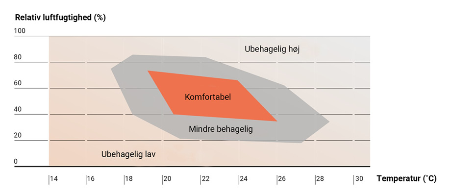 HVAC skal yde komfort for en bygnings brugere, så de har det godt og kan være fokuserede og/eller afslappede. Men faktisk er det kun inden for et ret lille spektrum af temperaturer mellem 19 og 26 °C, at vi mennesker føler os godt tilpas – alt efter luftfugtigheden – jf. figuren herunder. Bliver der varmere eller koldere, går det ud over velværet.
